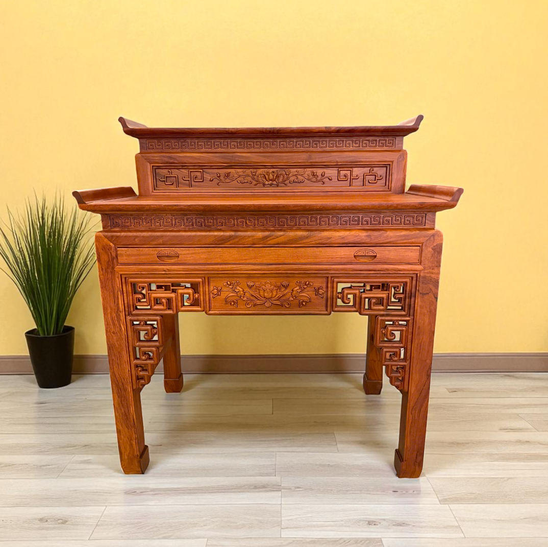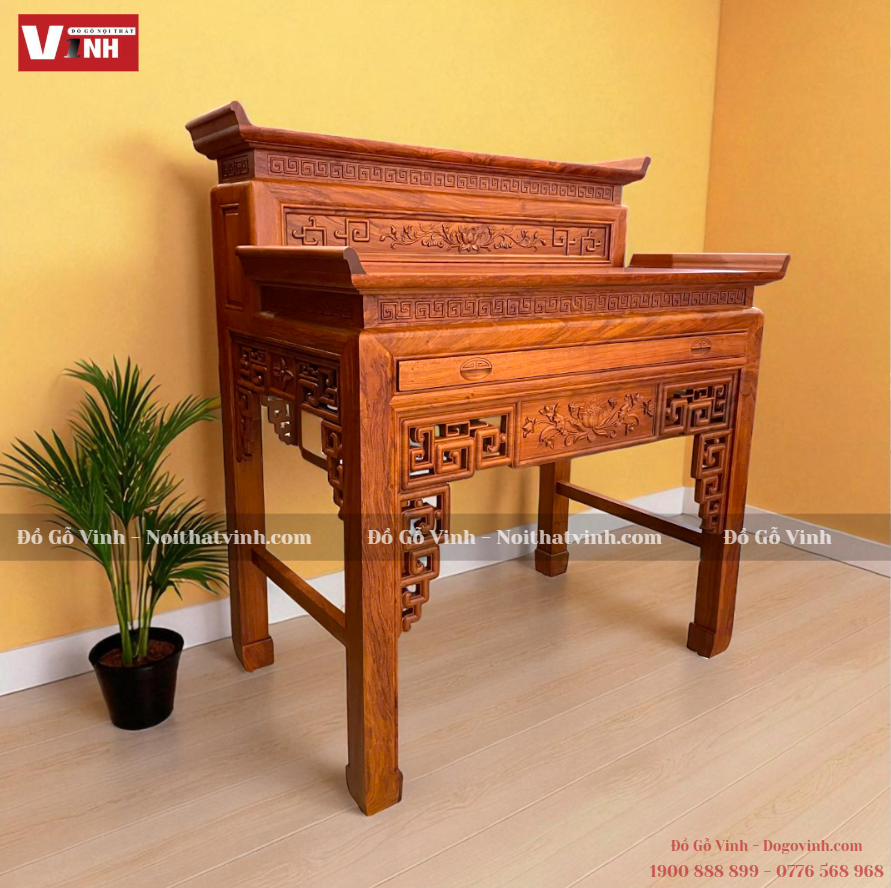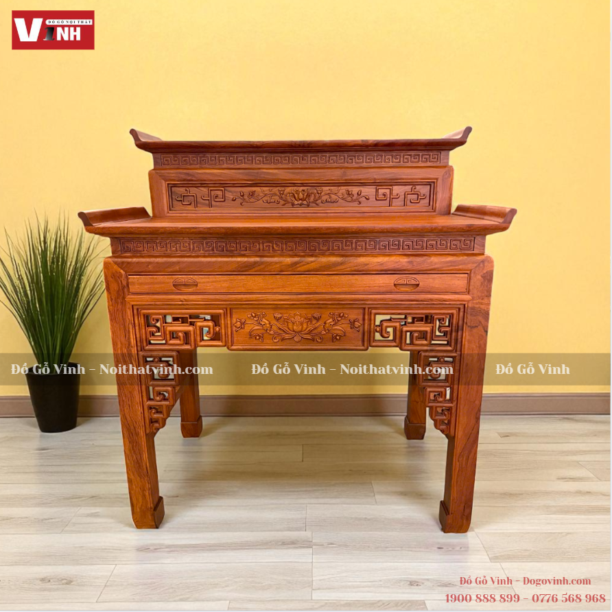 ✅ Mẫu án thờ 1m27 sen vuông – 2 cấp được chế tác từ gỗ hương đá, mang phong cách trang nghiêm và tinh tế, phù hợp cho không gian thờ cúng gia tiên.