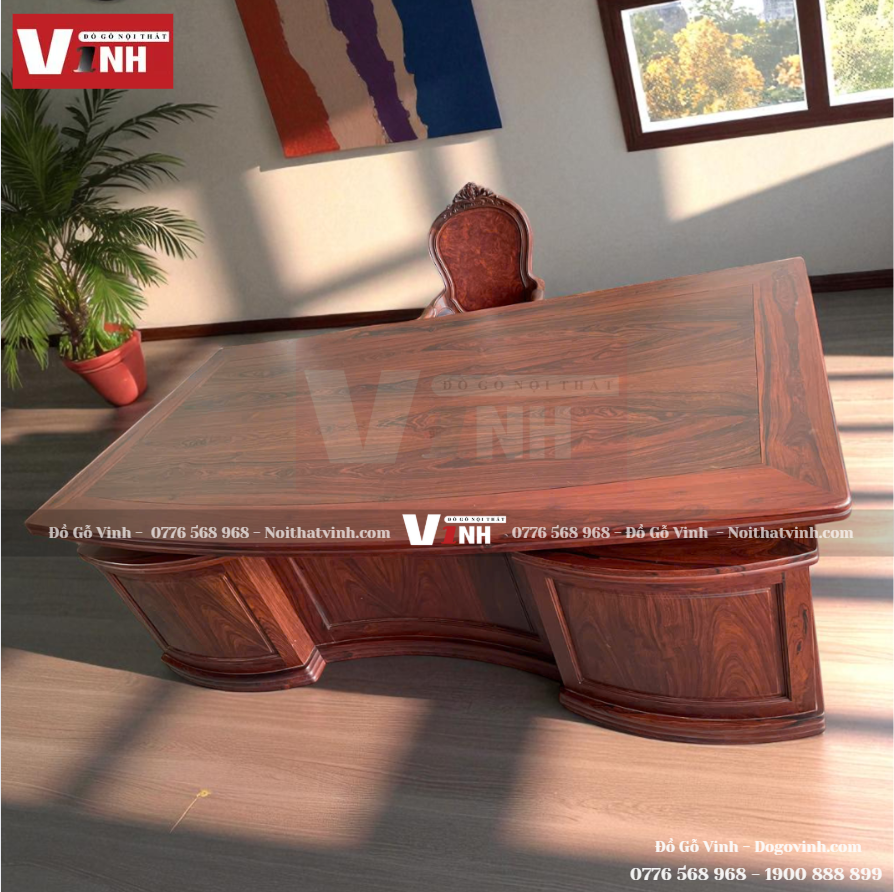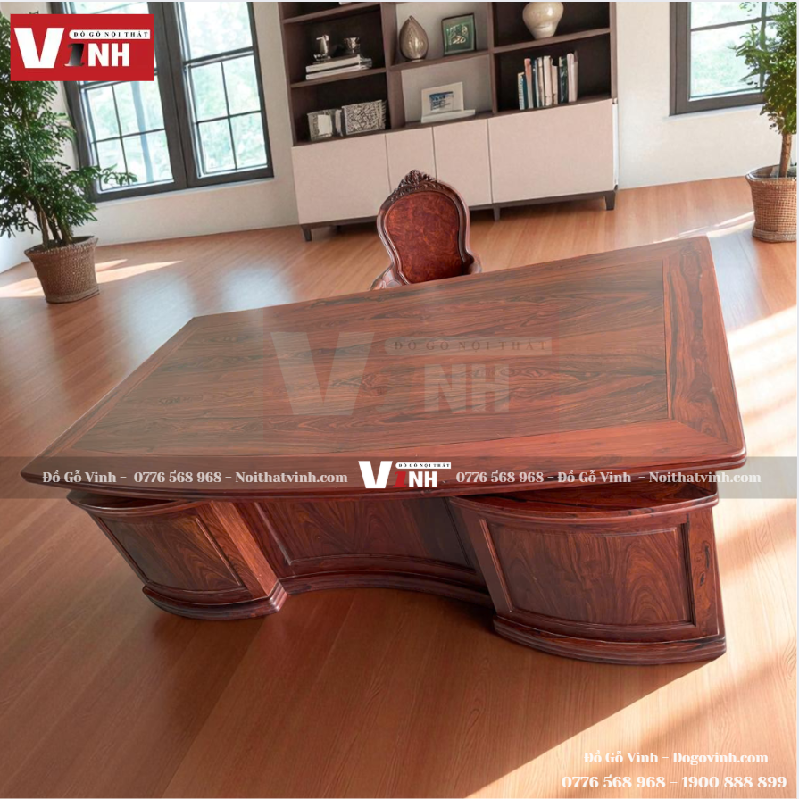 Mẫu bàn giám đốc 2m32 tại Đồ Gỗ Nội Thất Vinh là sản phẩm sang trọng dành riêng cho không gian làm việc cao cấp. Sản phẩm được chế tác từ gỗ cẩm lai quý hiếm, nổi bật với vân gỗ uyển chuyển, màu sắc sang trọng và độ bền vượt thời gian.