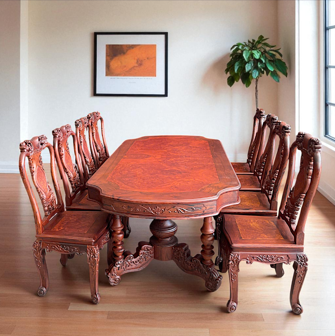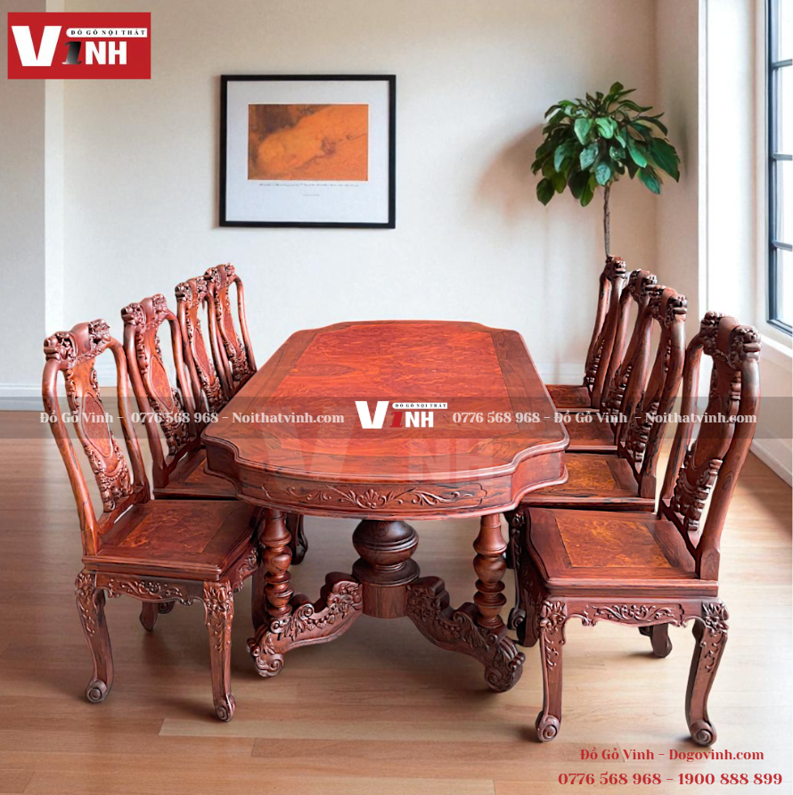 Nội Thất Vinh trân trọng giới thiệu sản phẩm bàn ăn oval 8 ghế đào, chế tác từ 100% gỗ Cẩm Lai quý hiếm – biểu tượng của sự thịnh vượng và bền vững.