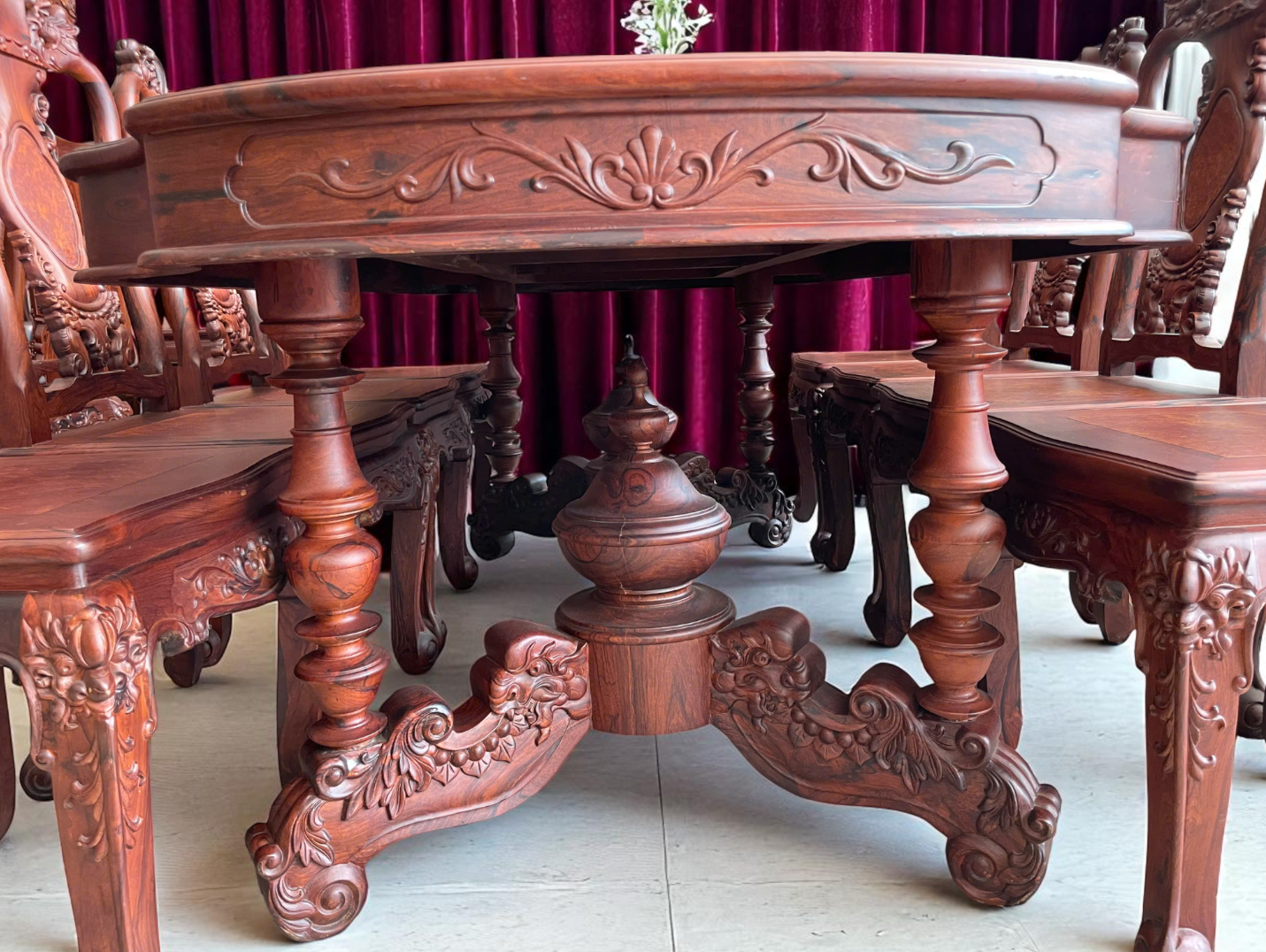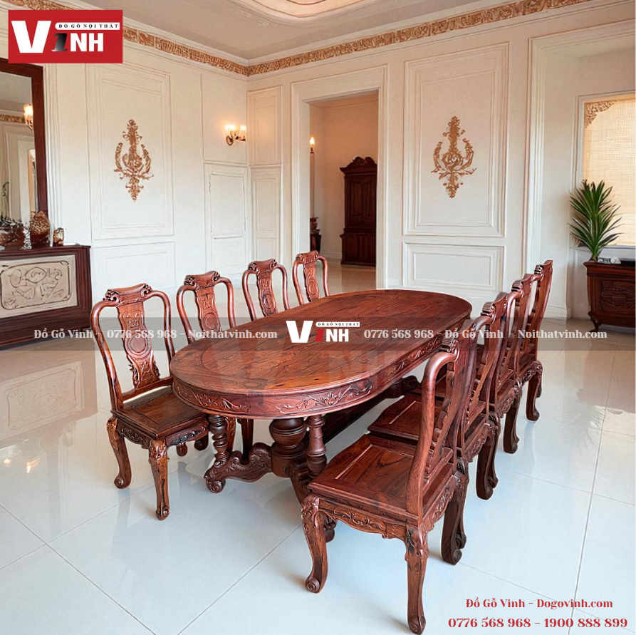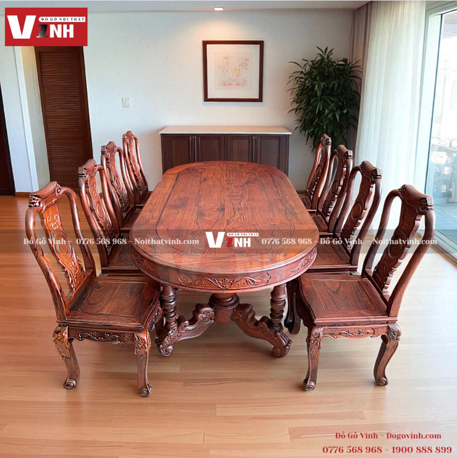 Nội Thất Vinh trân trọng giới thiệu sản phẩm bàn ăn oval 8 ghế đào, chế tác từ 100% gỗ Cẩm Lai quý hiếm – biểu tượng của sự thịnh vượng và bền vững.