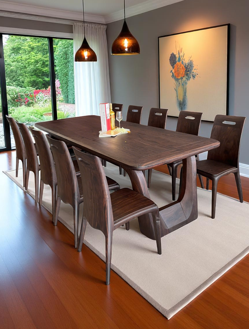 Bộ bàn ăn Caste + 10 ghế là lựa chọn hoàn hảo cho những ai yêu thích sự tinh tế, mạnh mẽ và sang trọng trong *nội thất Bình Dương*. Bộ sản phẩm được chế tác từ gỗ Chiu Liu tự nhiên – loại gỗ quý nổi bật với vân đen – nâu lạ mắt, màu sắc sang trọng và độ bền vượt thời gian.