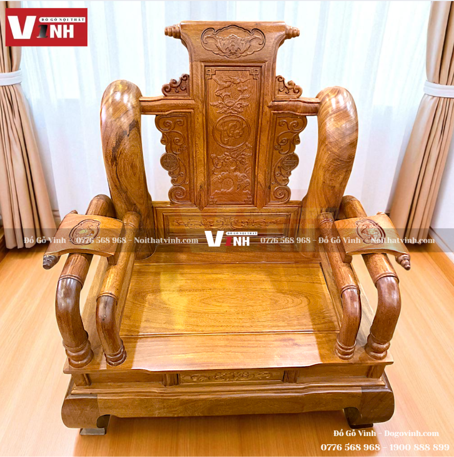 • Tựa ghế khắc chạm uy nghi, từng đường nét dứt khoát.