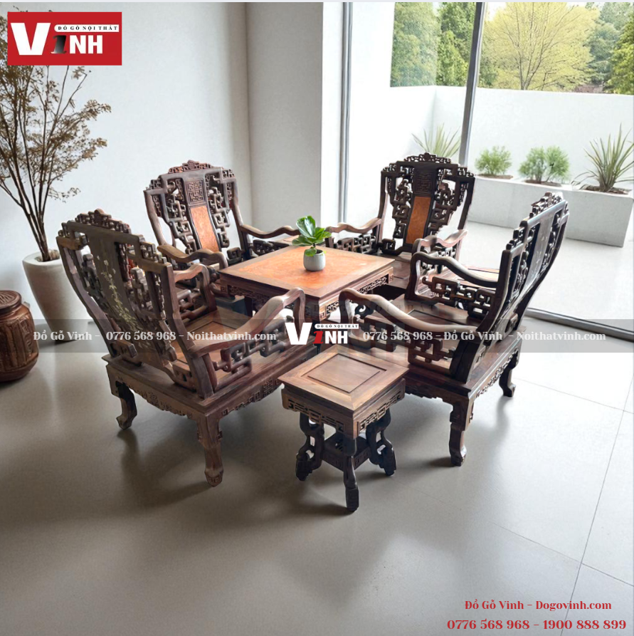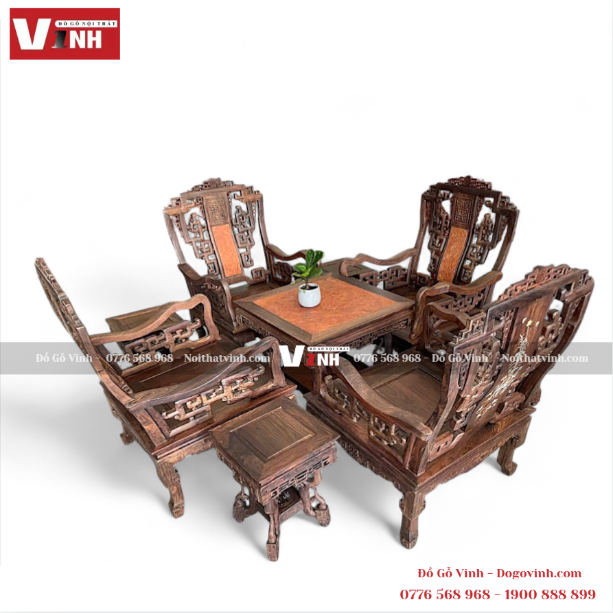 1 bàn, 4 ghế lớn và 4 đôn – được chế tác thủ công từ gỗ Trắc kết hợp gỗ Nu tự nhiên cao cấp.