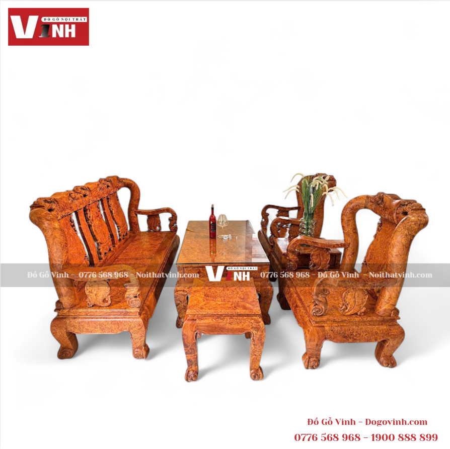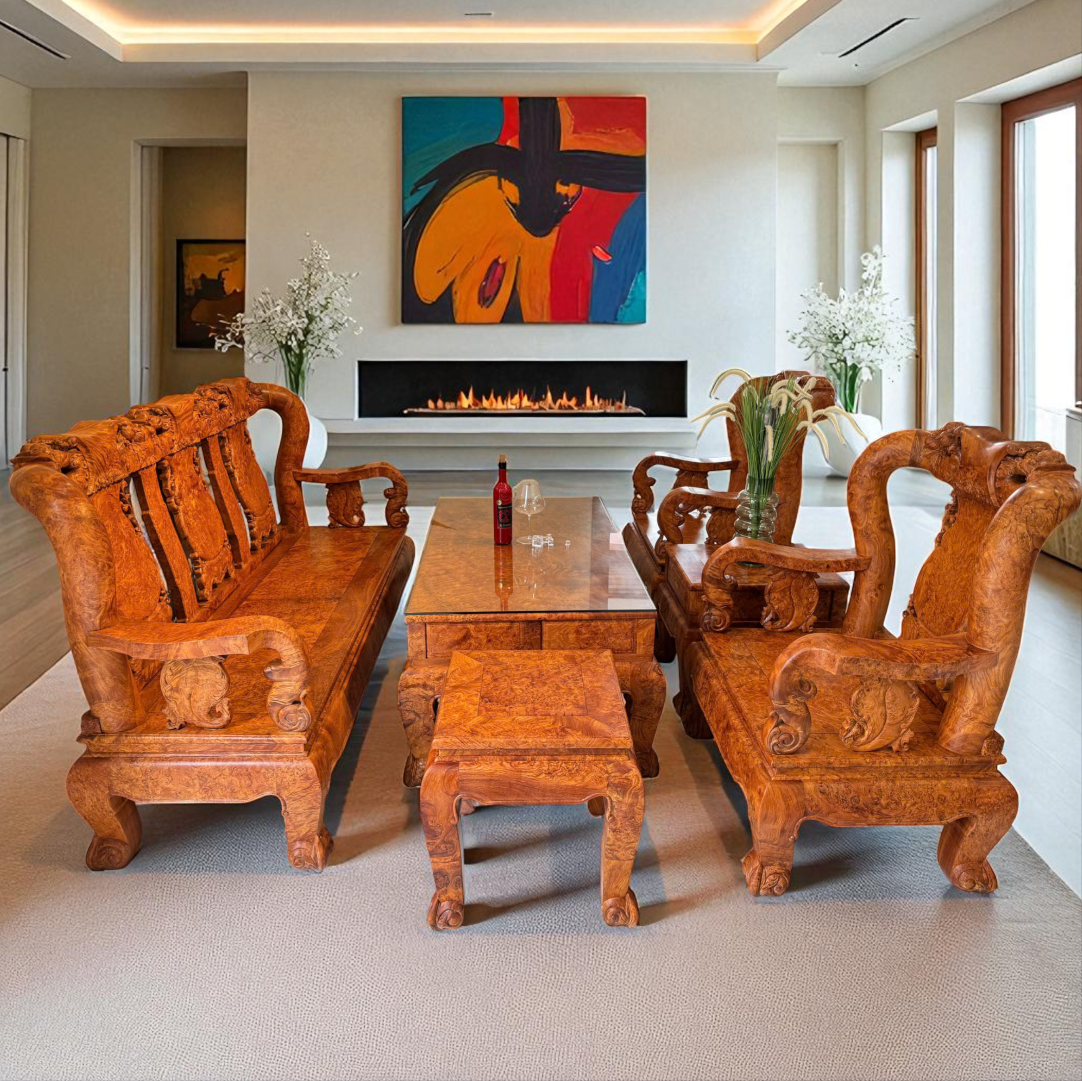 Bộ ghế được chế tác từ gỗ gõ đỏ kết hợp nu quý hiếm, nổi bật với những đường vân tự nhiên, độc bản.