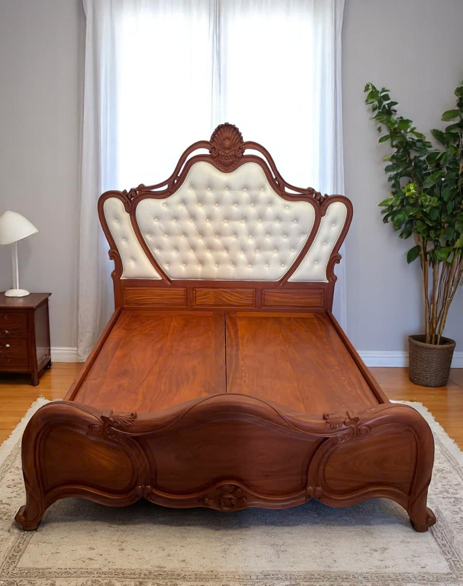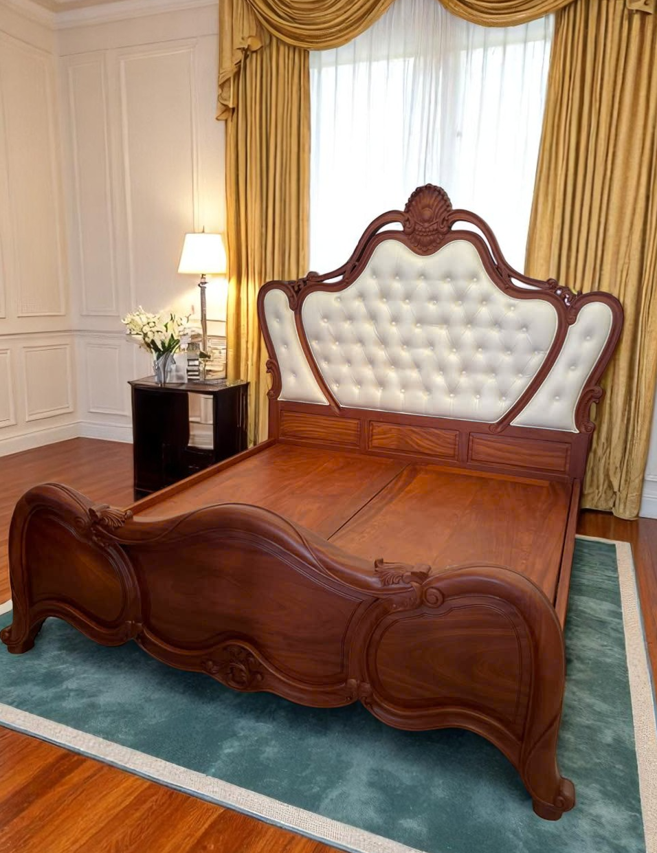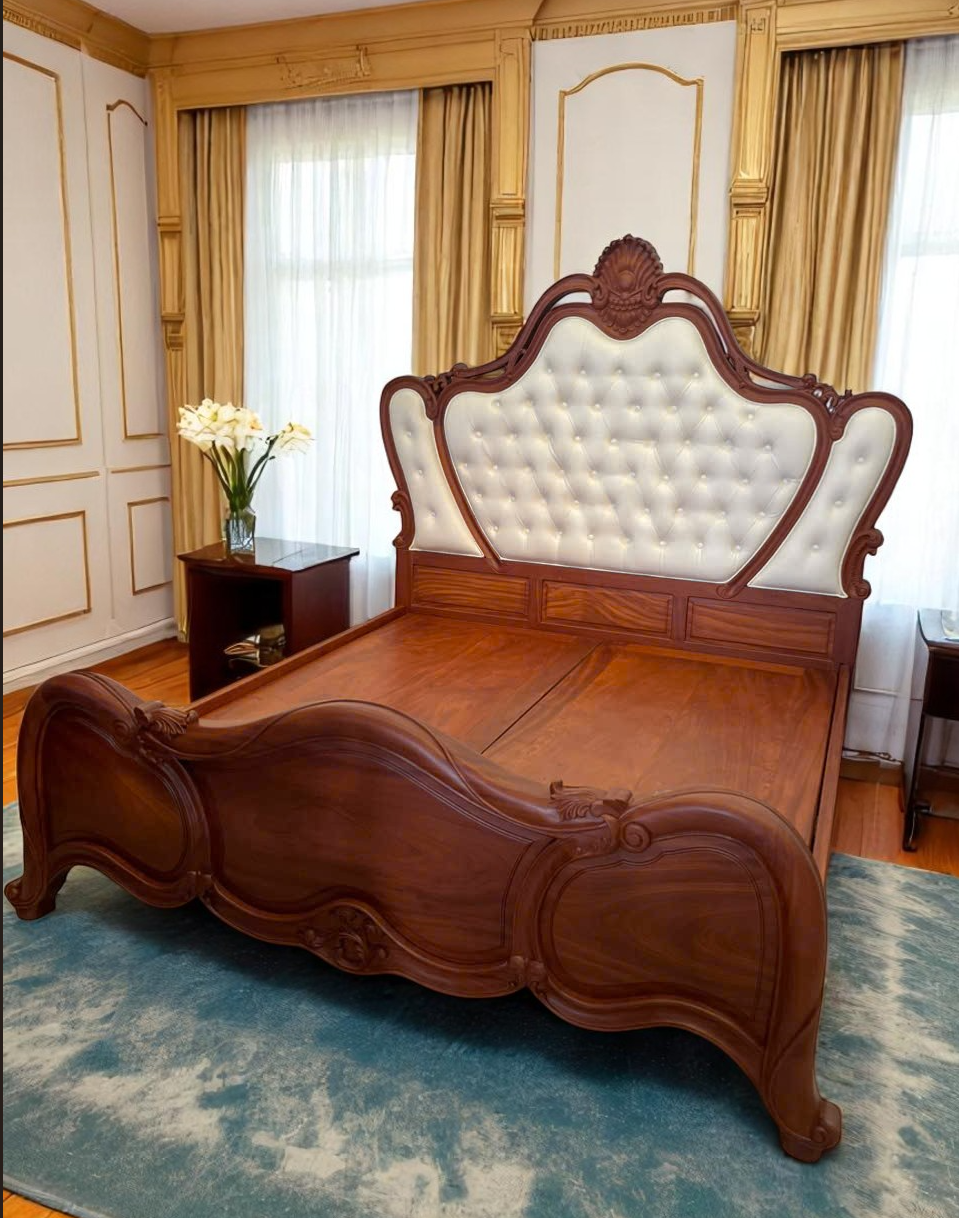 • Mẫu giường Louis đầu nệm Vip 1m8 là sự kết hợp hài hòa giữa phong cách cổ điển Pháp và đường nét thủ công tinh xảo. Phần đầu giường bọc nệm cao cấp, được chạm trổ sắc nét theo phong cách Louis, tạo cảm giác sang trọng cho không gian nghỉ ngơi.