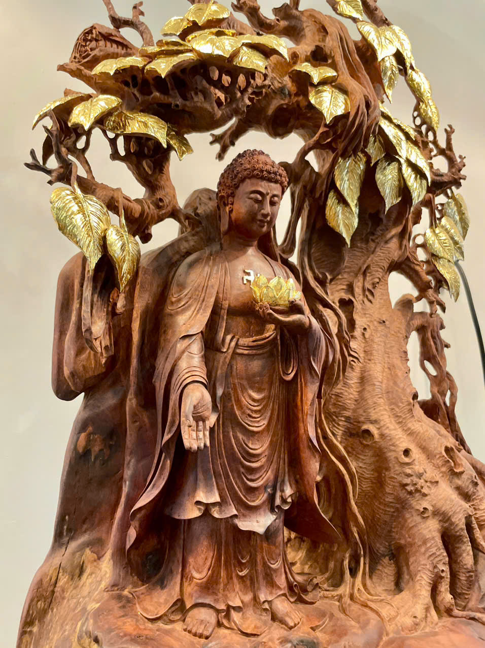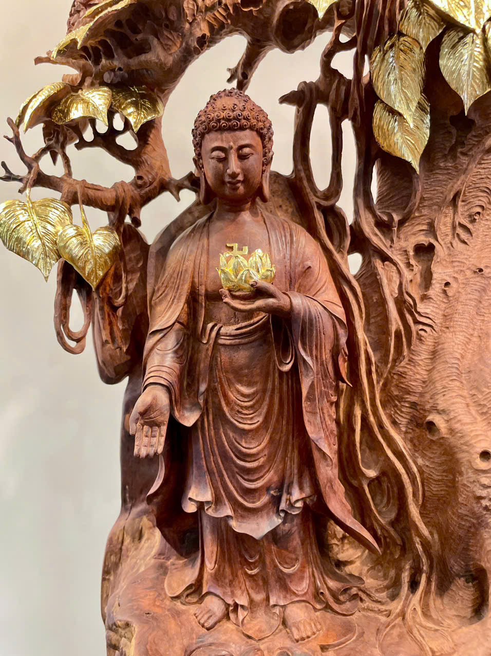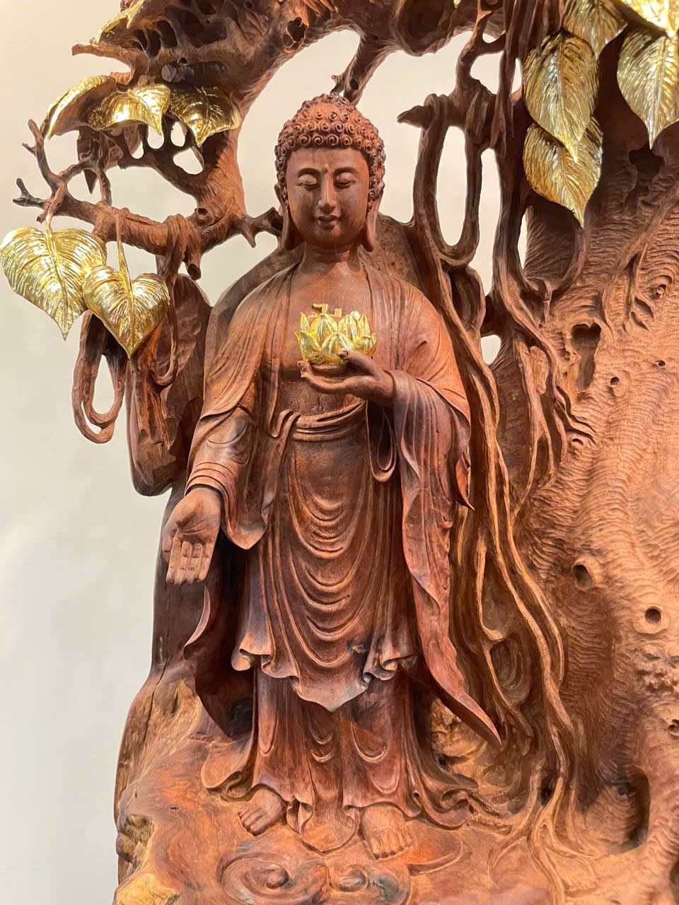 • Tượng Phật A Di Đà được chế tác hoàn toàn từ *nu hương Việt Nam* – dòng gỗ quý nổi bật với phần nu xoáy độc đáo, mỗi khối gỗ mang hình dáng và kết cấu riêng biệt không thể sao chép. Chính vì thế, mỗi tác phẩm là *độc bản duy nhất*.