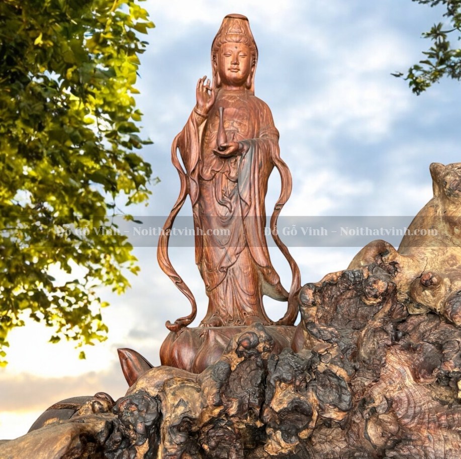 Tượng Quan Âm không chỉ là vật phẩm trang trí, mà còn là biểu tượng của từ bi, che chở, an yên và sự bảo hộ cho gia chủ. Từ ánh mắt hiền hòa đến tà áo nhẹ bay, từng chi tiết được chạm bằng tay – với tất cả sự tôn kính.